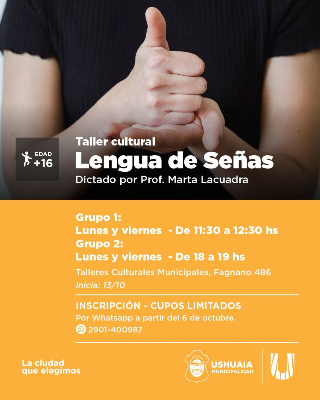 La Secretaría de Cultura y Educación de la Municipalidad de Ushuaia informa a vecinos y vecinas que se encuentran abiertas las inscripciones al taller de “Lengua de Señas” a cargo de la profesora Marta Lacuadra.
