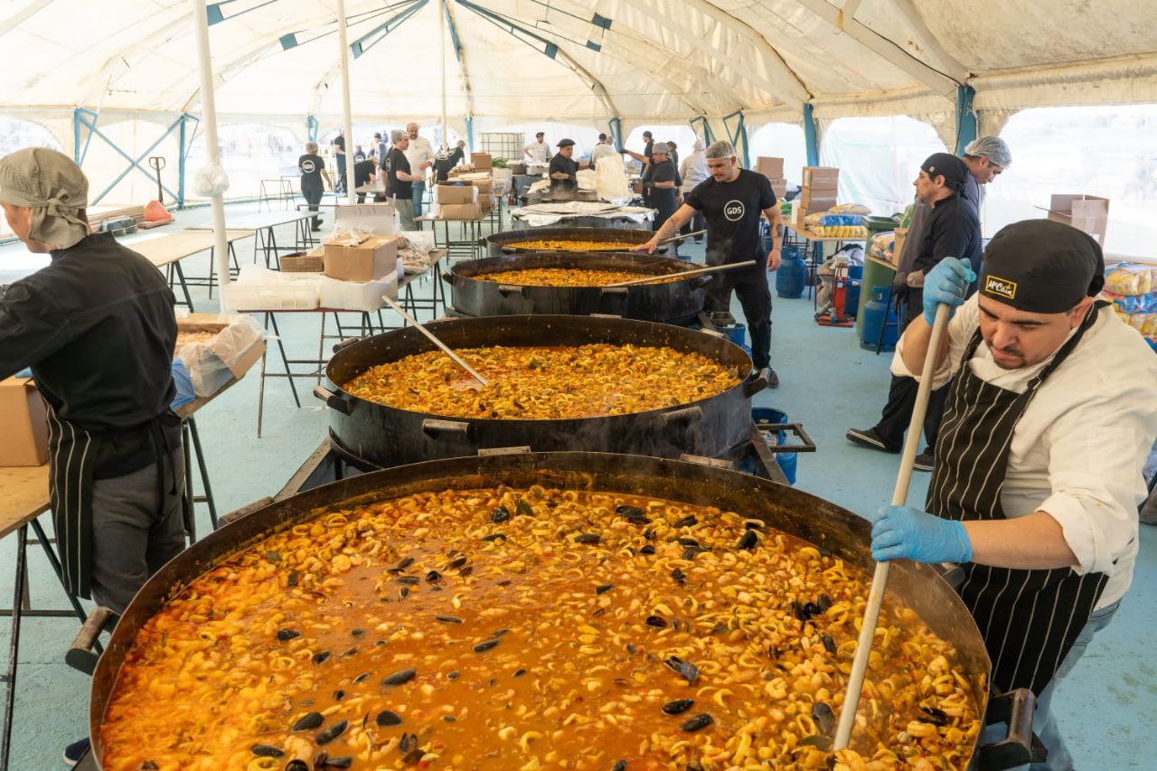 La paella estuvo a cargo de Gastronomía del Sur (GDS), empresa que desplegó un operativo de más de 100 profesionales y montó 15 paelleras —entre ellas, una versión vegetariana— para cocinar y servir las 15 mil porciones gratuitas destinadas a la comunidad. La entrega comenzó a las 14 horas y se extendió durante más de tres horas, en un clima de alegría y celebración compartida.