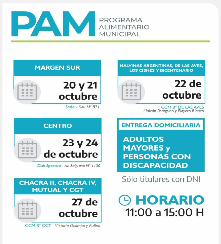 El Municipio de Río Grande recuerda a las vecinas y vecinos que el lunes 20 de octubre comenzará la distribución de los módulos alimentarios a las vecinas y vecinos de diferentes puntos de la ciudad que están empadronados en el Programa Alimentario Municipal.