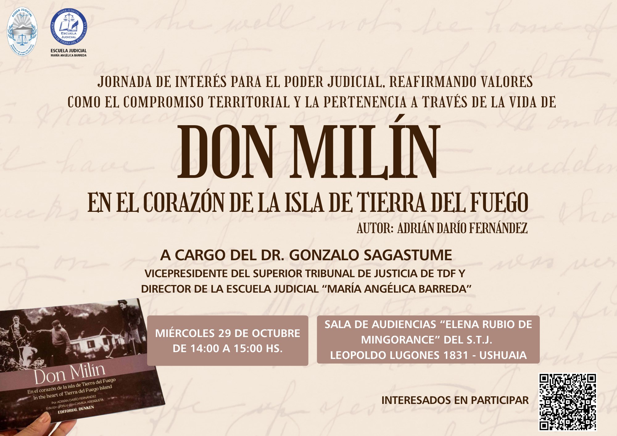 El Poder Judicial de Tierra del Fuego, a través de su Escuela Judicial “María Angélica Barreda”, invita a la comunidad a participar de una jornada especial que abordará los valores de compromiso territorial y pertenencia a partir de la vida de uno de los pioneros más emblemáticos de la provincia: “Don Milín”.