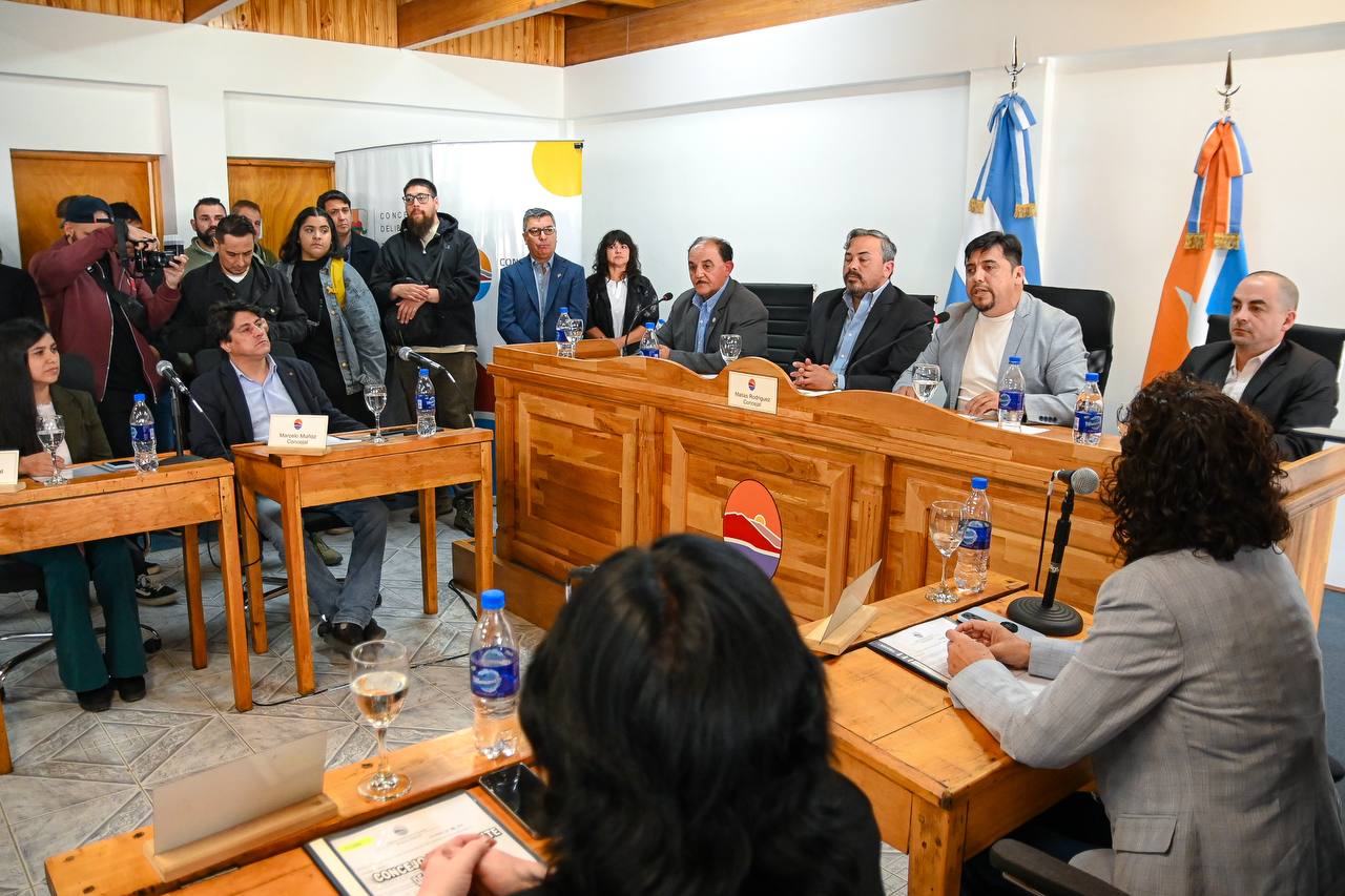 El discurso también incluyó una agenda ambiental de escala territorial. Harrington señaló que el ejido urbano comprende casi 80.000 hectáreas y que el 80% corresponde a bosque nativo, lo que consideró una “ventaja estratégica”. En ese marco, mencionó el proceso impulsado junto a ICLEI y ACBIO que dio origen a la “Red Verde Tolhuin”, con restauración de 150 hectáreas degradadas, integración de humedales, conectividad ecológica con el Lago Fagnano y reducción de riesgos ambientales.