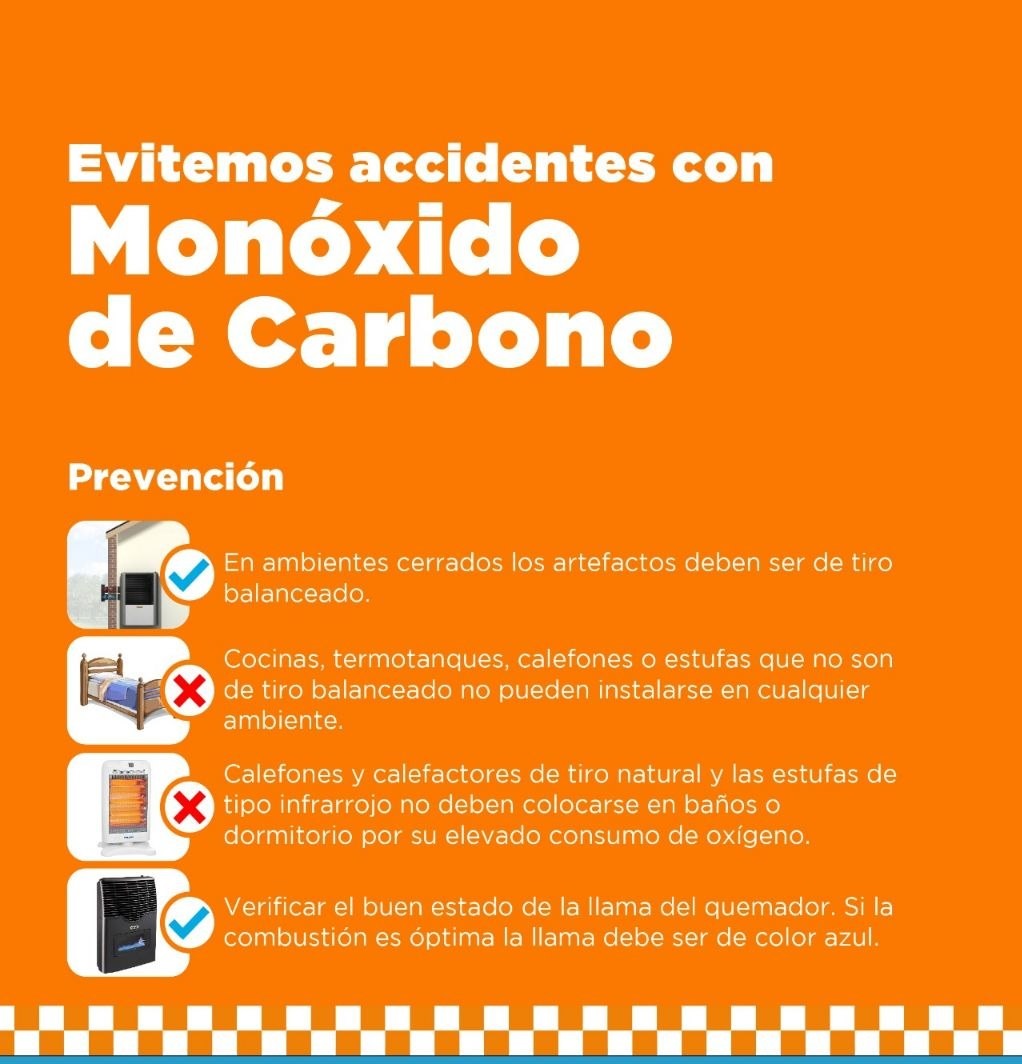 Desde el organismo explicaron que “el monóxido de carbono es un gas que no tiene olor, color ni sabor, generado por la combustión de artefactos a gas o leña. Una instalación incorrecta, la falta de mantenimiento o la escasa ventilación pueden producir intoxicación y poner en riesgo la salud. Esto ocurre cuando el gas es inhalado y, dependiendo de la concentración, puede provocar desde síntomas leves hasta consecuencias graves, incluyendo la muerte”.