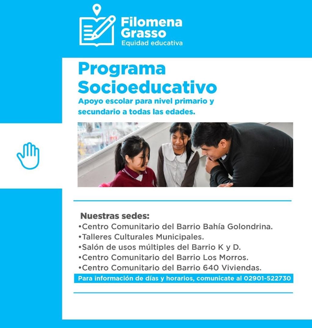 Para conocer más sobre los puntos y horarios del Programa Socioeducativo Municipal “Filomena Grasso”, las y los interesados podrán acercarse a los puntos antes mencionados, así como comunicarse al 2901-522730 o visitar las redes de la Secretaría de Políticas Ambientales, Culturales y Educativas de la Municipalidad de Ushuaia en @AmbienteCulturaEducacion.Ush
